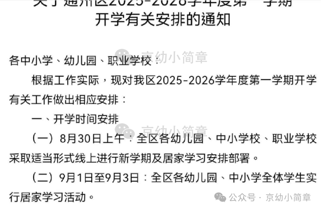 由于9月3日大型活动,目前海淀、东城、西城、朝阳、丰台、通州、昌平、平谷、门头沟、石景山、顺义和大兴明确通知了,其他区也会统一通知。还没收到通知的,请耐心等待,以学校通知为准。